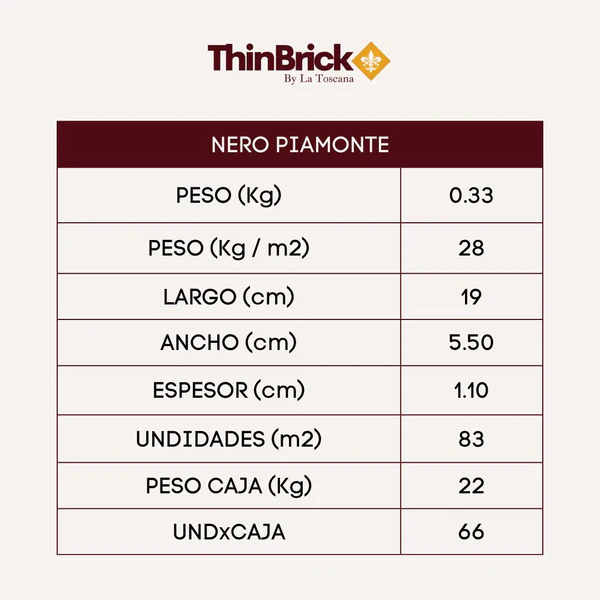 Peso (k) = 0,33 / Peso (kg/m2) = 28 / Largo (cm) = 19 / Ancho (cm) 5.50 / Espesor (cm) = 1,10 / caja (m2) = 83 / Peso caja (kg) = 22 / Und x caja = 66